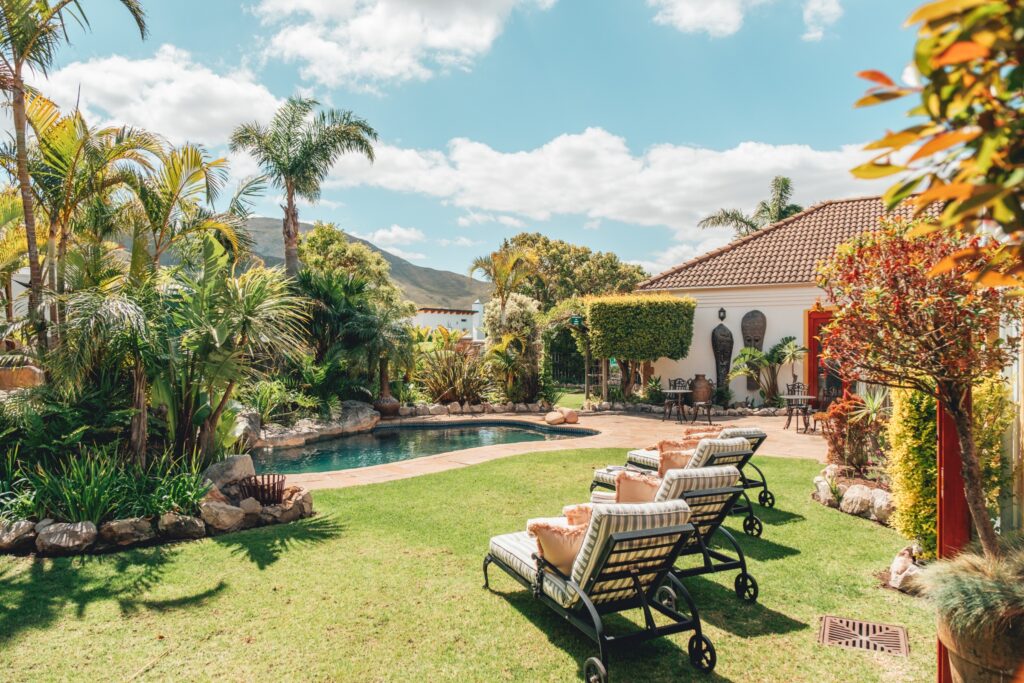 Der liebevoll gestaltete Garten mit Pool, ruhigen Sitzbereichen und viel Privatsphäre lädt dazu ein, einfach abzuschalten – sei es bei einem guten Glas südafrikanischen Wein oder einem entspannten Nachmittag in der Sonne.